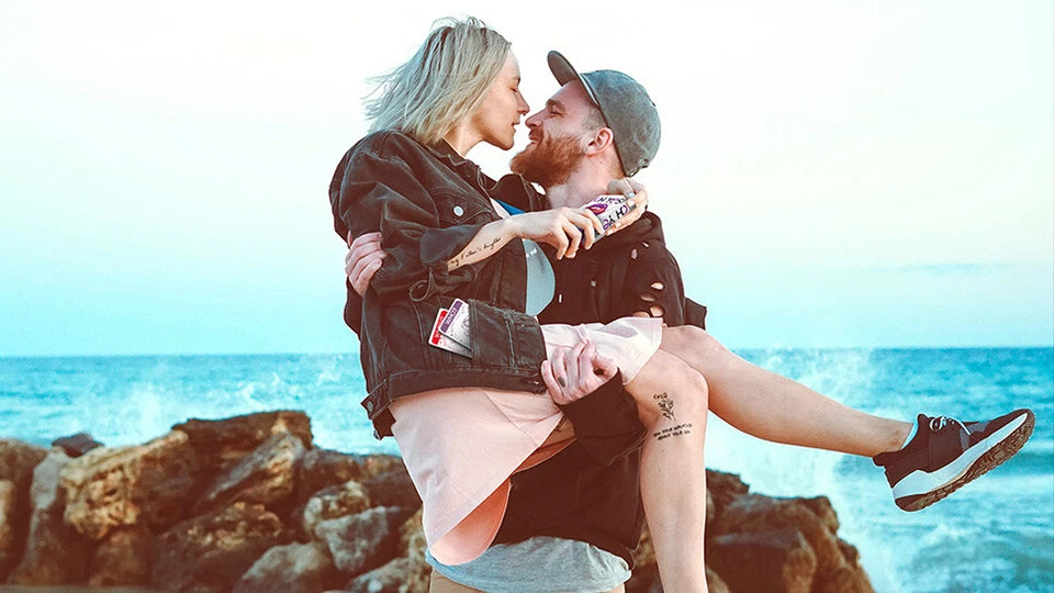 Zdjęcie przedstawia parę kochanków na pościeli, wokół których rozsypane są karty z gry dla par oh yes Purple.